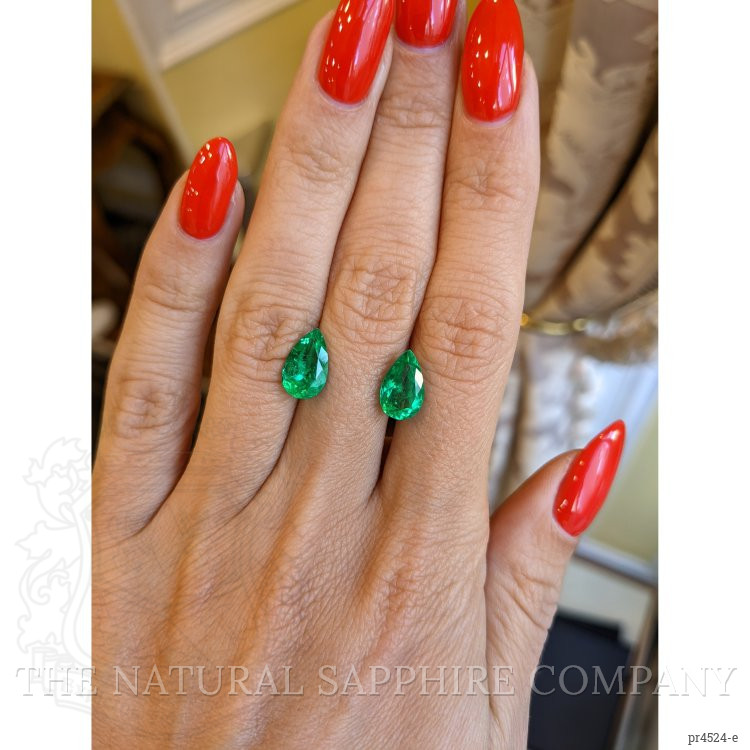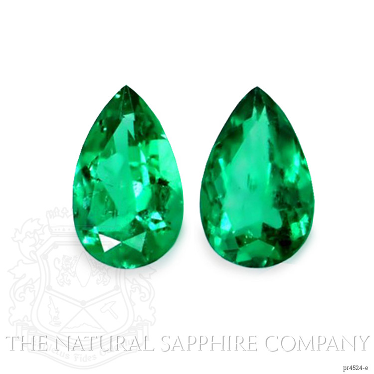 The beautiful, transparent pair of emeralds are 1.56 carats and 1.82 carats respectively. They are pear shape green emeralds, with the dimensions of 10.77 x 6.55 x 4.43 mm and 10.66 x 6.64 x 4.88 mm and are mixed brilliant cut, have a clarity grade of very slightly included (evaluated at eye level), intense color intensity, and an excellent polish. The origin of this pair of emeralds is Colombia.