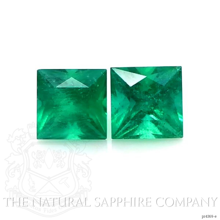The earrings feature a beautiful, transparent pair of emeralds that are 0.86 total carat weight. They are princess shape green emeralds, with the dimensions of 4.50 x 4.48 x 3.51 mm and are princess cut, have a clarity grade of very slightly included (evaluated at eye level), intense color saturation, and an excellent polish. The origin of this pair of emeralds is Zambia.