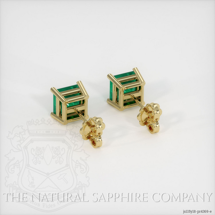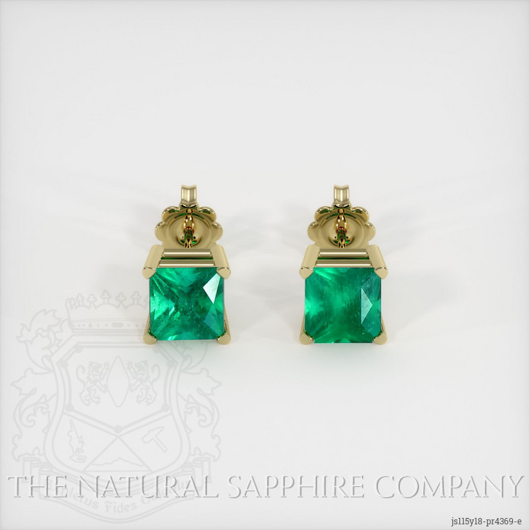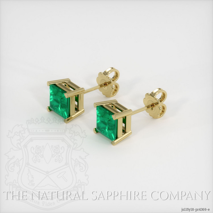 The earrings feature a beautiful, transparent pair of emeralds that are 0.86 total carat weight. They are princess shape green emeralds, with the dimensions of 4.50 x 4.48 x 3.51 mm and are princess cut, have a clarity grade of very slightly included (evaluated at eye level), intense color saturation, and an excellent polish. The origin of this pair of emeralds is Zambia.