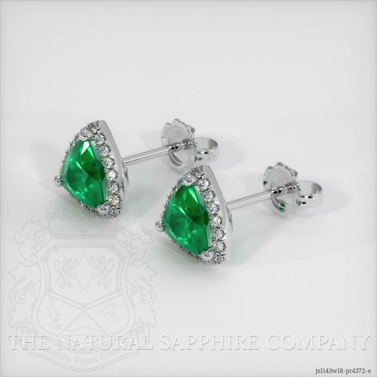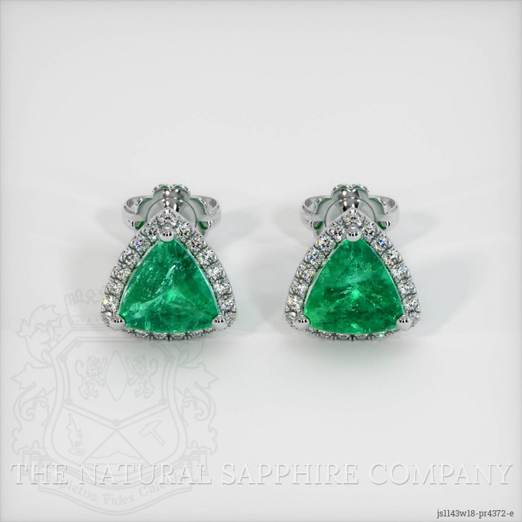 The earrings feature a beautiful, transparent pair of emeralds that are 1.05 total carat weight. They are trillion shape green emeralds, with the dimensions of 5.42 x 5.60 x 3.76 mm and are trillion cut, have a clarity grade of very slightly included (evaluated at eye level), intense color saturation, and an excellent polish. The origin of this pair of emeralds is Zambia.
