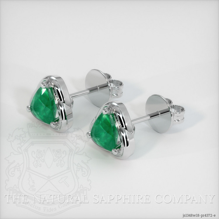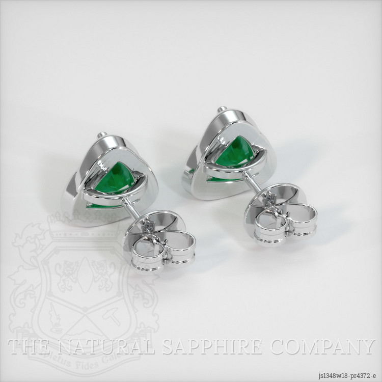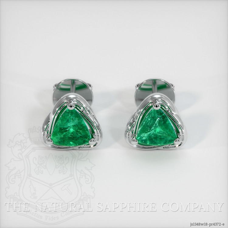The earrings feature a beautiful, transparent pair of emeralds that are 1.05 total carat weight. They are trillion shape green emeralds, with the dimensions of 5.50 x 5.40 x 3.70 mm and are trillion cut, have a clarity grade of very slightly included (evaluated at eye level), intense color saturation, and an excellent polish. The origin of this pair of emeralds is Zambia.
