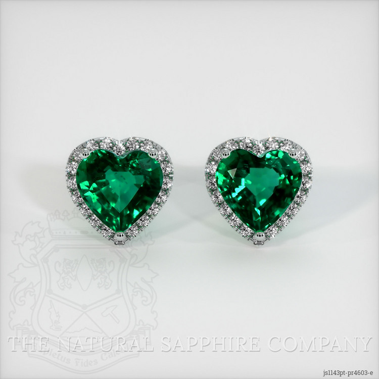 The earrings feature a beautiful, transparent pair of emeralds that are 2.55 total carat weight. They are heart shape green emeralds, with the dimensions of 7.30 x 7.60 x 4.42 mm and are mixed brilliant cut, have a clarity grade of very slightly included (evaluated at eye level), vivid color saturation, and an excellent polish. The origin of this pair of emeralds is Zambia.