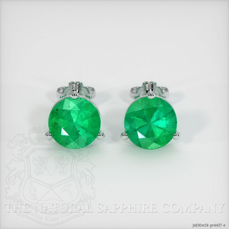 The earrings feature a beautiful, transparent pair of emeralds that are 0.80 total carat weight. They are round shape green emeralds, with the dimensions of 5.06 x 5.04 x 3.43 mm and are mixed brilliant cut, have a clarity grade of very slightly included (evaluated at eye level), intense color saturation, and an excellent polish. The origin of this pair of emeralds is Zambia.