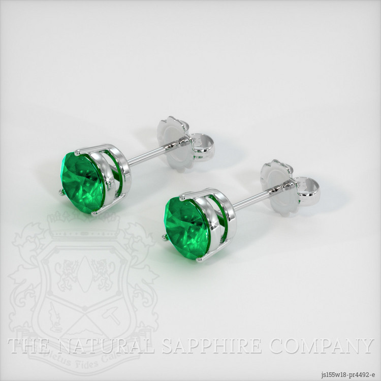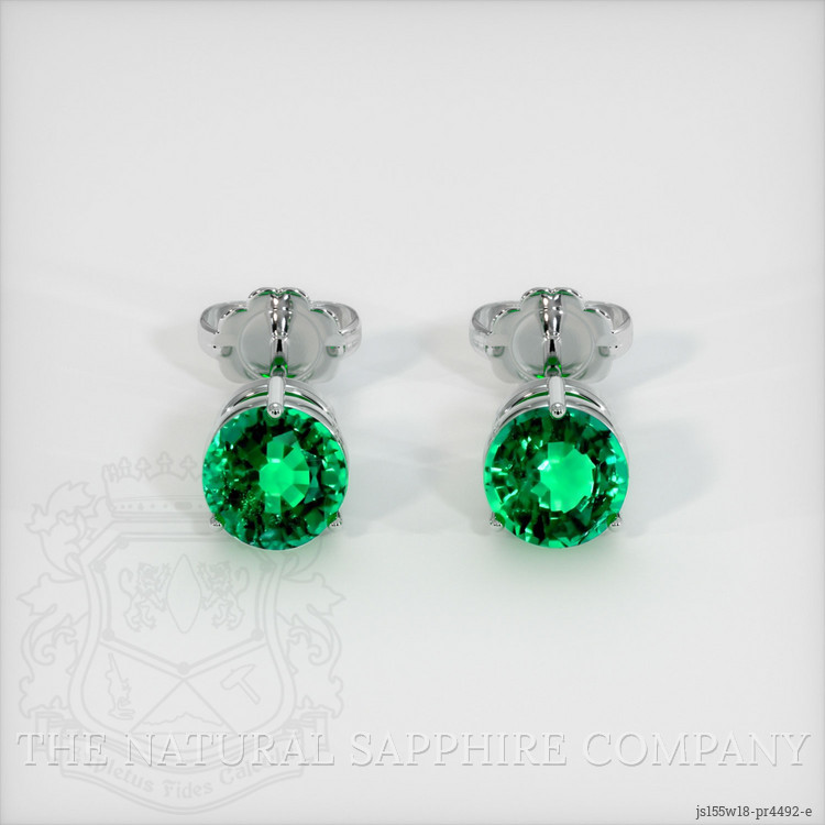 The earrings feature a beautiful, transparent pair of emeralds that are 1.28 total carat weight. They are round shape green emeralds, with the dimensions of 5.67 x 5.57 x 3.89 mm and are mixed brilliant cut, have a clarity grade of very slightly included (evaluated at eye level), vivid color saturation, and an excellent polish. The origin of this pair of emeralds is Zambia.