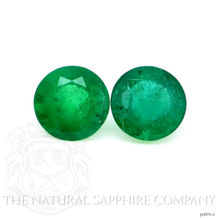 The earrings feature a beautiful, transparent pair of emeralds that are 2.27 total carat weight. They are round shape green emeralds, with the dimensions of 6.84 x 6.73 x 4.34 mm and are mixed brilliant cut, have a clarity grade of slightly included (evaluated at eye level), intense color saturation, and an excellent polish. The origin of this pair of emeralds is Zambia.