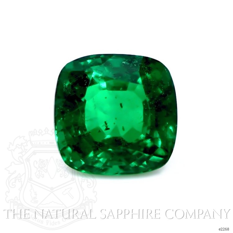The pendant features a beautiful, transparent 2.31 carat cushion shape green emerald with the dimensions of 8.09 x 7.96 x 5.53 mm and a mixed brilliant cut. It has a clarity grade of very slightly included (evaluated at eye level), vivid color saturation, and an excellent polish. The origin of this emerald is Zambia.