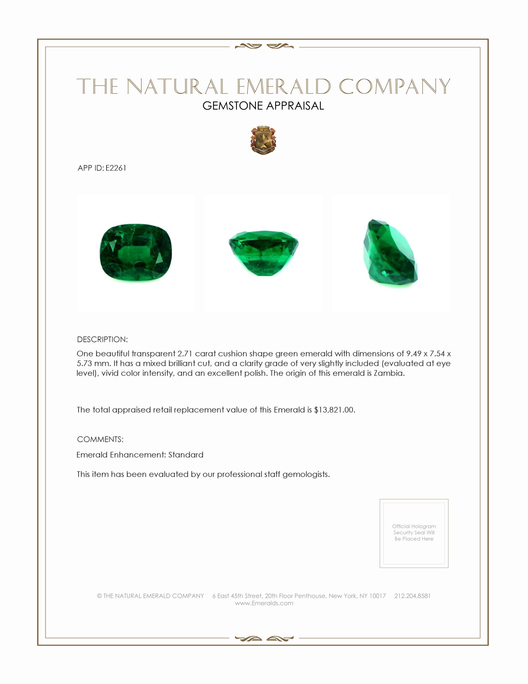 The pendant features a beautiful, transparent 2.71 carat cushion shape green emerald with the dimensions of 9.49 x 7.54 x 5.73 mm and a mixed brilliant cut. It has a clarity grade of very slightly included (evaluated at eye level), vivid color saturation, and an excellent polish. The origin of this emerald is Zambia.