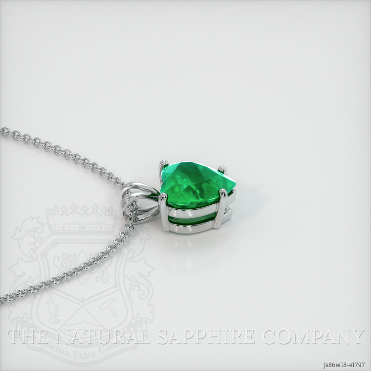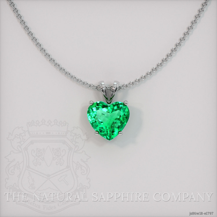 The pendant features a beautiful, transparent 3.67 carat heart shape green emerald with the dimensions of 10.40 x 11.27 x 6.23 mm and a mixed brilliant cut. It has a clarity grade of slightly included (evaluated at eye level), intense color saturation, and an excellent polish. The origin of this emerald is Colombia.