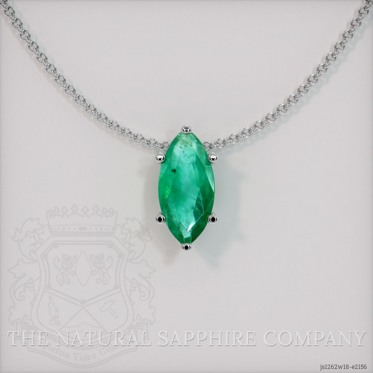 The pendant features a beautiful, transparent 0.48 carat marquise shape green emerald with the dimensions of 7.99 x 4.01 x 2.55 mm and a mixed brilliant cut. It has a clarity grade of very slightly included (evaluated at eye level), medium color saturation, and an excellent polish. The origin of this emerald is Zambia.