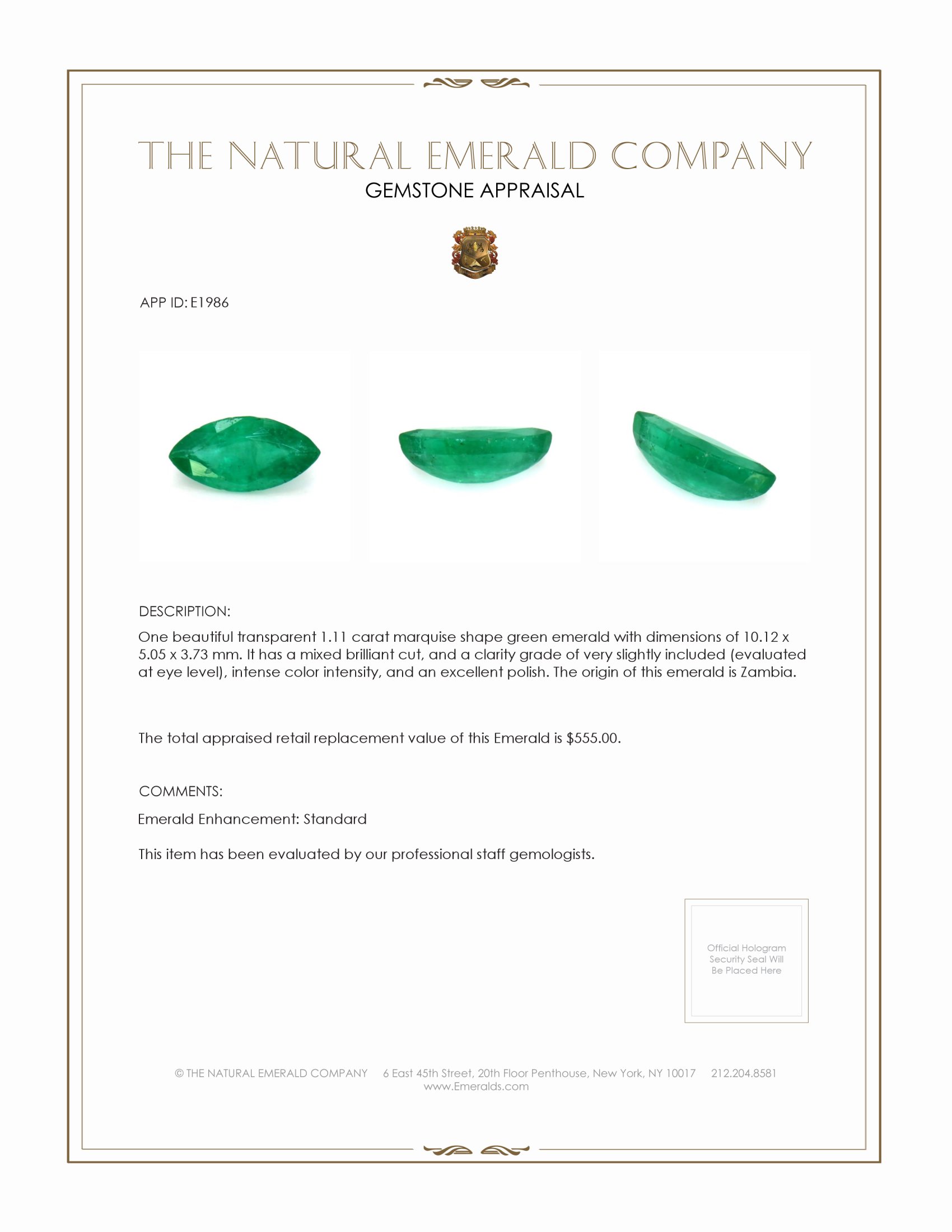 One beautiful transparent 1.11 carat marquise shape green emerald with dimensions of 10.12 x 5.05 x 3.73 mm. It has a mixed brilliant cut, and a clarity grade of very slightly included (evaluated at eye level), intense color intensity, and an excellent polish. The origin of this emerald is Zambia.