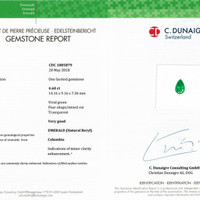 The pendant features a beautiful, transparent C.Dunaigre certified 4.60 carat pear shape green emerald with the dimensions of 14.18 x 9.17 x 7.40 mm and a mixed brilliant cut. It has a clarity grade of very slightly included (evaluated at eye level), vivid color saturation, and an excellent polish. The origin of this emerald is Colombia.
