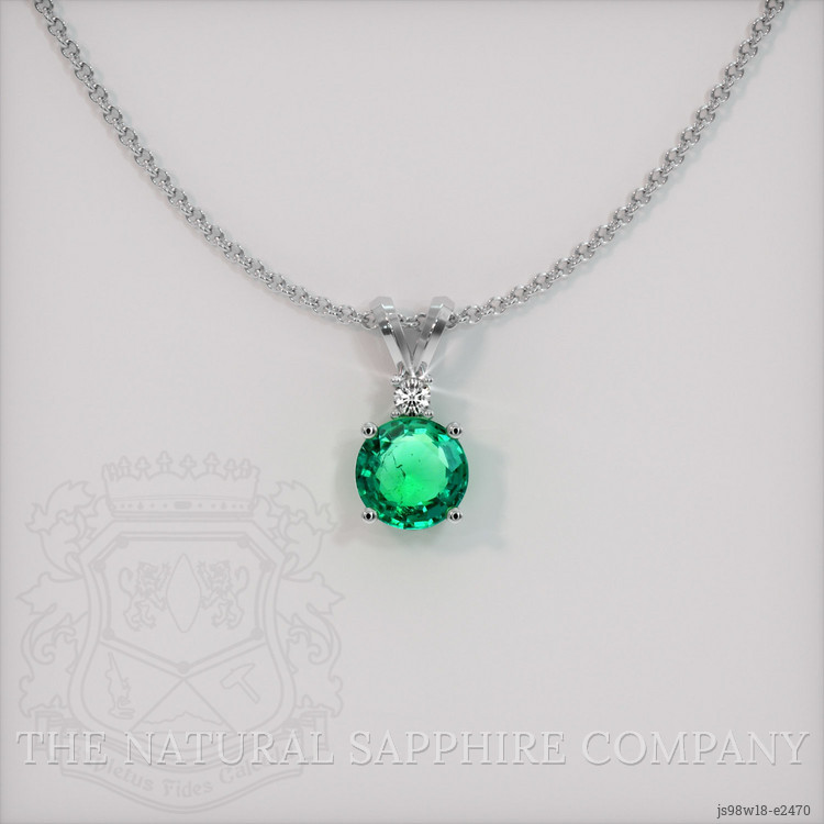 The pendant features a beautiful, transparent 0.60 carat round shape green emerald with the dimensions of 6.07 x 5.98 x 2.97 mm and a mixed brilliant cut. It has a clarity grade of very slightly included (evaluated at eye level), medium color saturation, and an excellent polish. The origin of this emerald is Zambia.