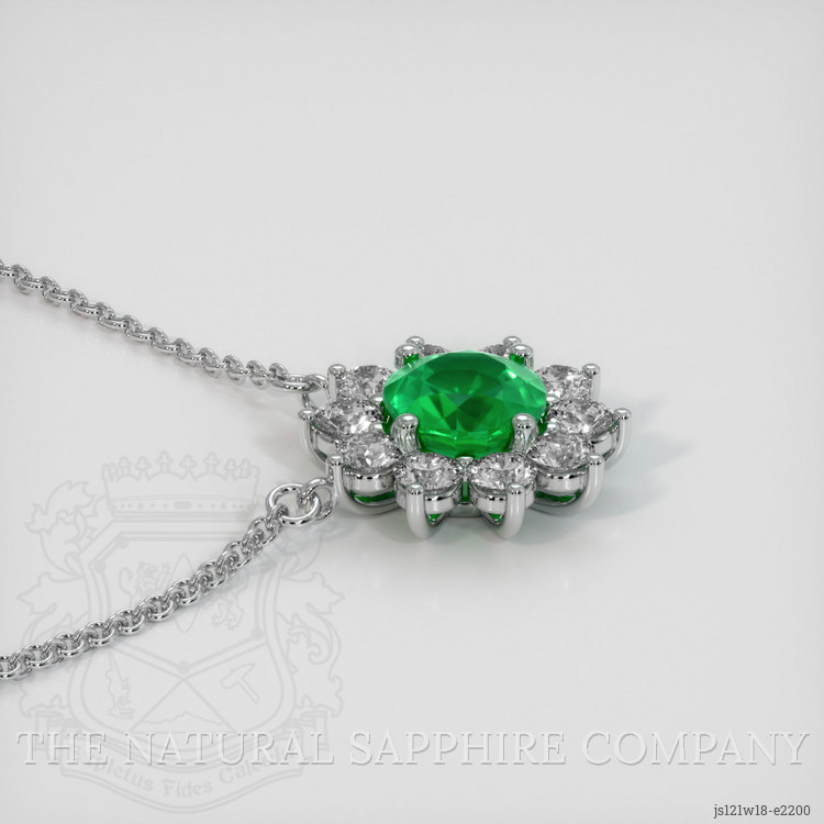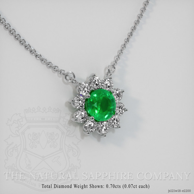 The necklace features a beautiful, transparent 0.93 carat round shape green emerald with the dimensions of 6.51 x 6.38 x 3.91 mm and a mixed brilliant cut. It has a clarity grade of very slightly included (evaluated at eye level), vivid color saturation, and an excellent polish. The origin of this emerald is Zambia.