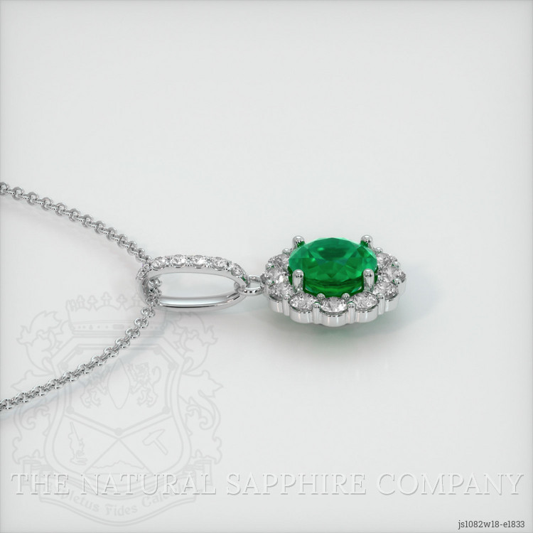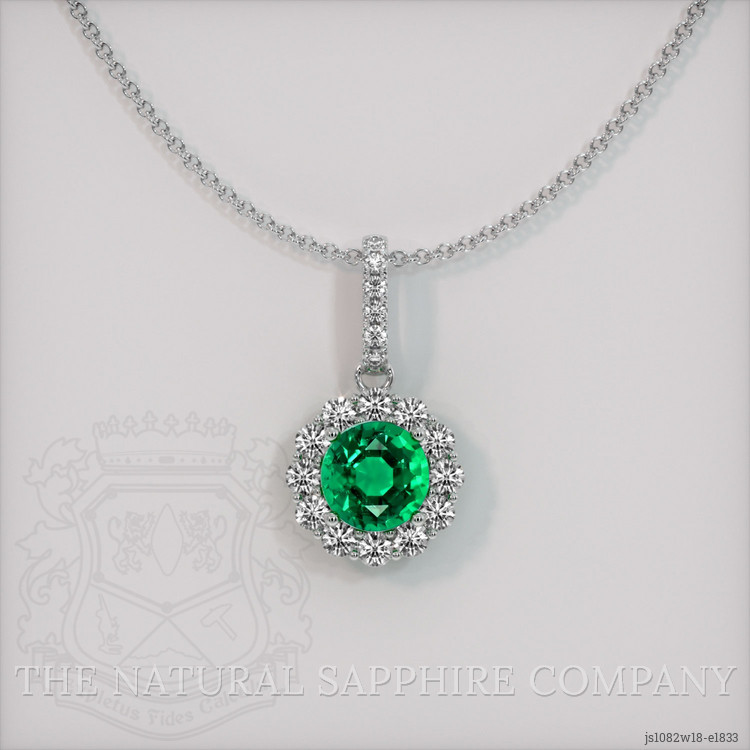 The pendant features a beautiful, transparent 0.98 carat round shape green emerald with the dimensions of 6.42 x 6.27 x 4.45 mm and a mixed brilliant cut. It has a clarity grade of eye clean (evaluated at eye level), intense color saturation, and an excellent polish. The origin of this emerald is Zambia.