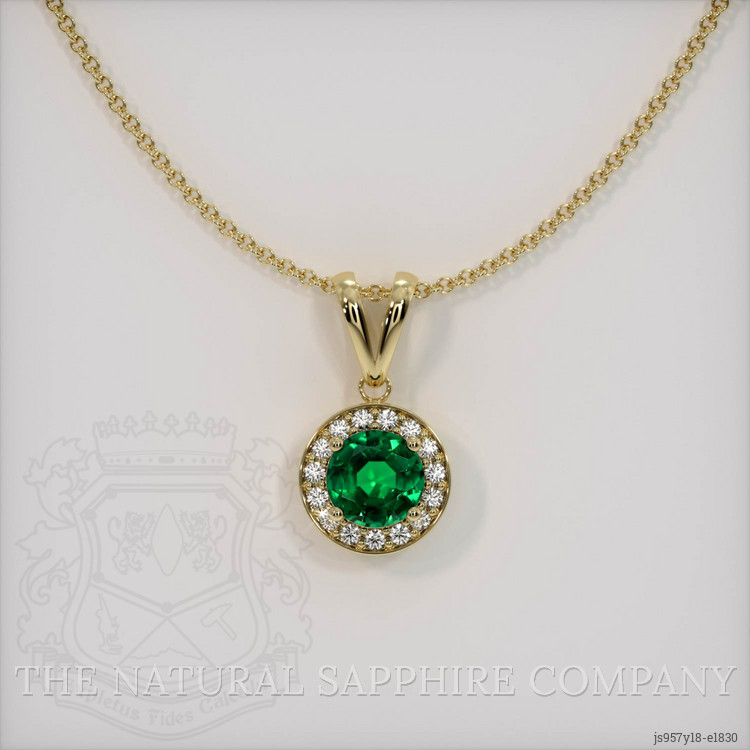 The pendant features a beautiful, transparent GIA certified 1.04 carat round shape green emerald with the dimensions of 6.44 x 6.35 x 4.30 mm and a mixed brilliant cut. It has a clarity grade of eye clean (evaluated at eye level), vivid color saturation, and an excellent polish. The origin of this emerald is Zambia.