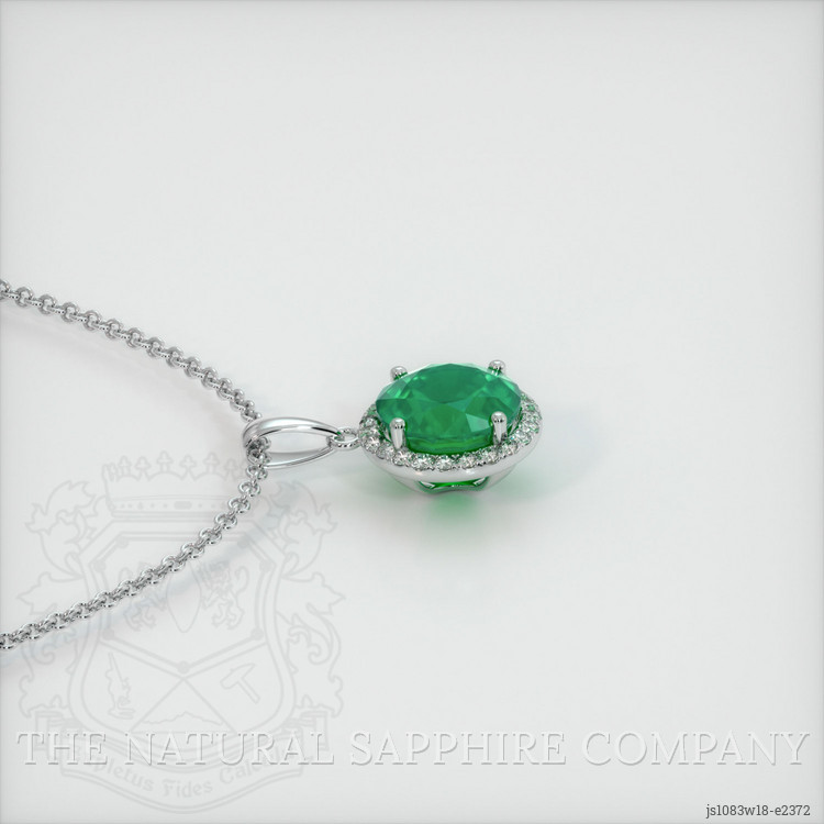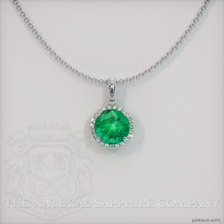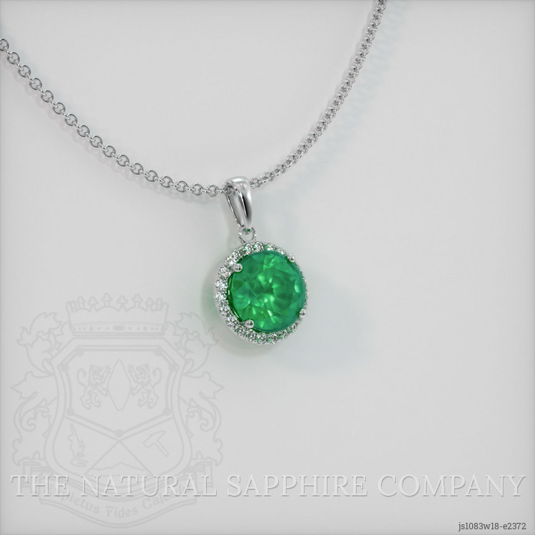 The pendant features a beautiful, transparent 1.11 carat round shape green emerald with the dimensions of 6.69 x 6.57 x 4.71 mm and a mixed brilliant cut. It has a clarity grade of slightly included (evaluated at eye level), intense color saturation, and an excellent polish. The origin of this emerald is Zambia.