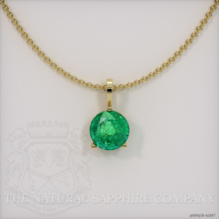 The pendant features a beautiful, transparent 1.37 carat round shape green emerald with the dimensions of 7.12 x 7.04 x 4.98 mm and a mixed brilliant cut. It has a clarity grade of slightly included (evaluated at eye level), medium color saturation, and an excellent polish. The origin of this emerald is Zambia.