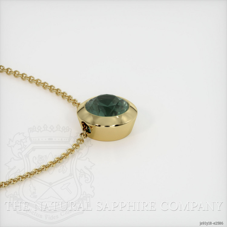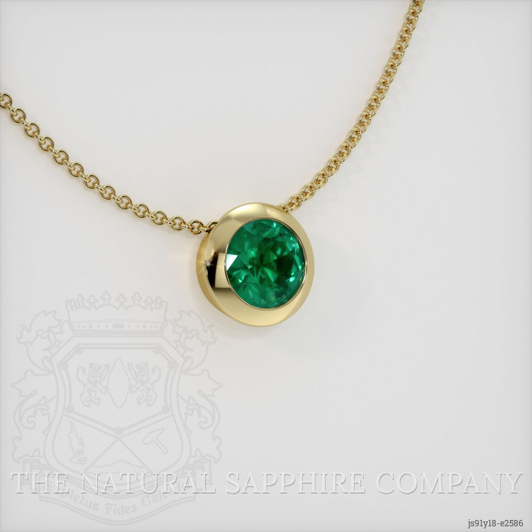 The pendant features a beautiful, transparent 1.74 carat round shape green emerald with the dimensions of 8.13 x 8.11 x 5.24 mm and a mixed brilliant cut. It has a clarity grade of very slightly included (evaluated at eye level), vivid color saturation, and an excellent polish. The origin of this emerald is Zambia.