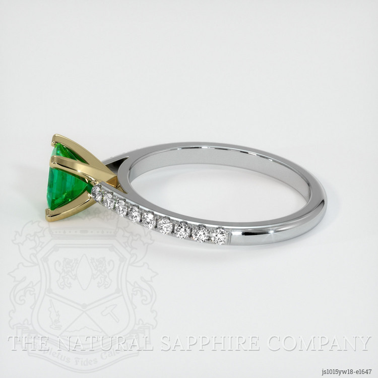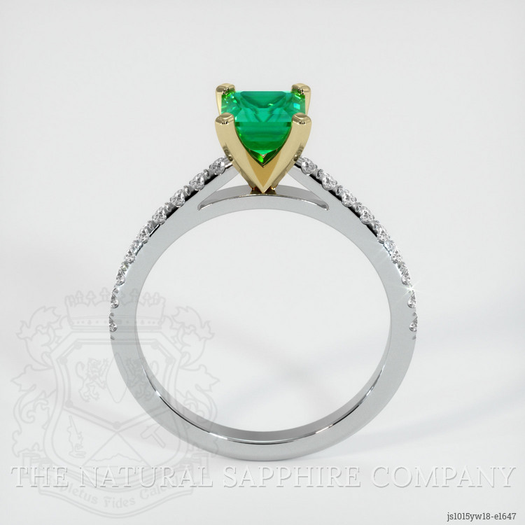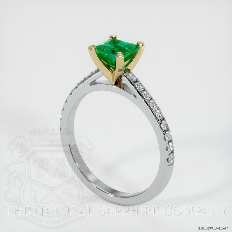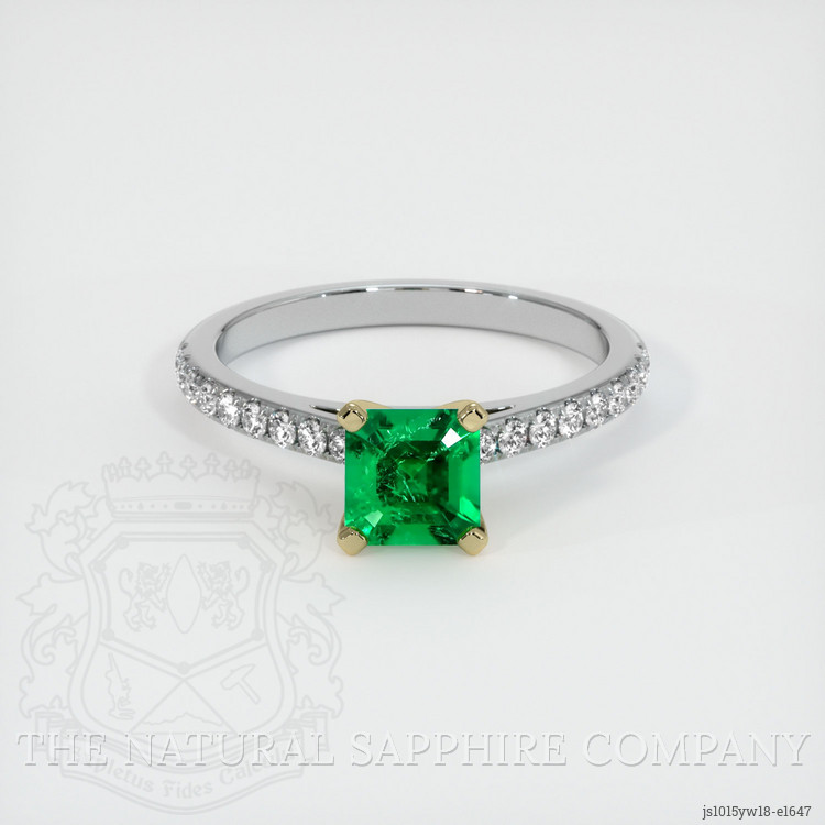The ring features a beautiful, transparent 0.79 carat asscher shape green emerald with the dimensions of 5.79 x 5.70 x 3.96 mm and a asscher cut. It has a clarity grade of very slightly included (evaluated at eye level), intense color saturation, and an excellent polish. The origin of this emerald is Colombia.