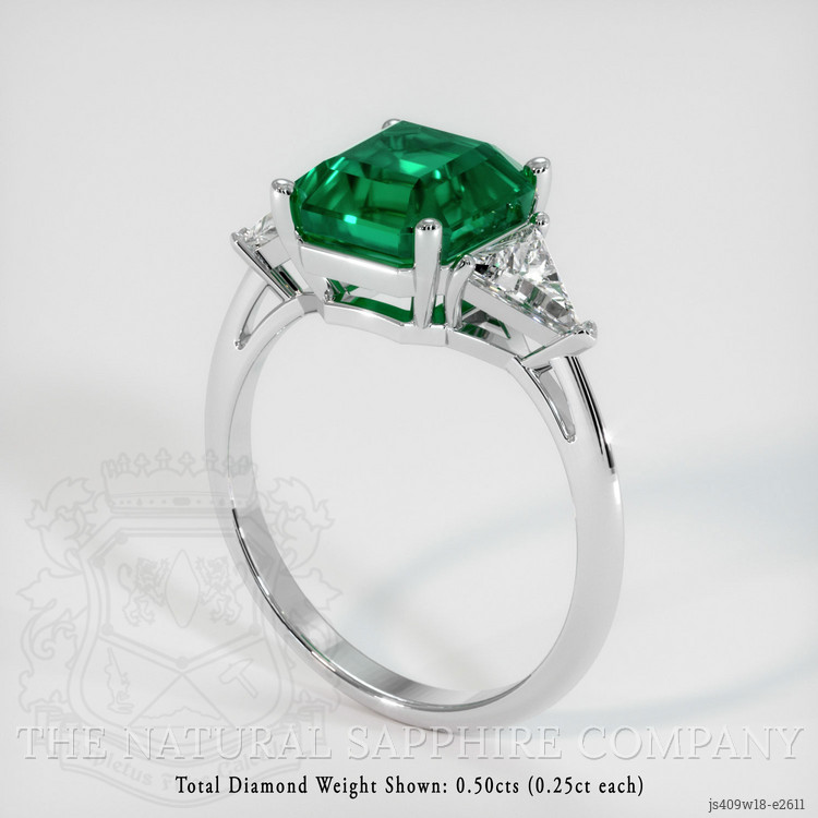 The ring features a beautiful, transparent 2.79 carat asscher - octagon shape green emerald with the dimensions of 8.39 x 7.67 x 6.19 mm and a asscher cut. It has a clarity grade of very slightly included (evaluated at eye level), vivid color saturation, and an excellent polish. The origin of this emerald is Zambia.
