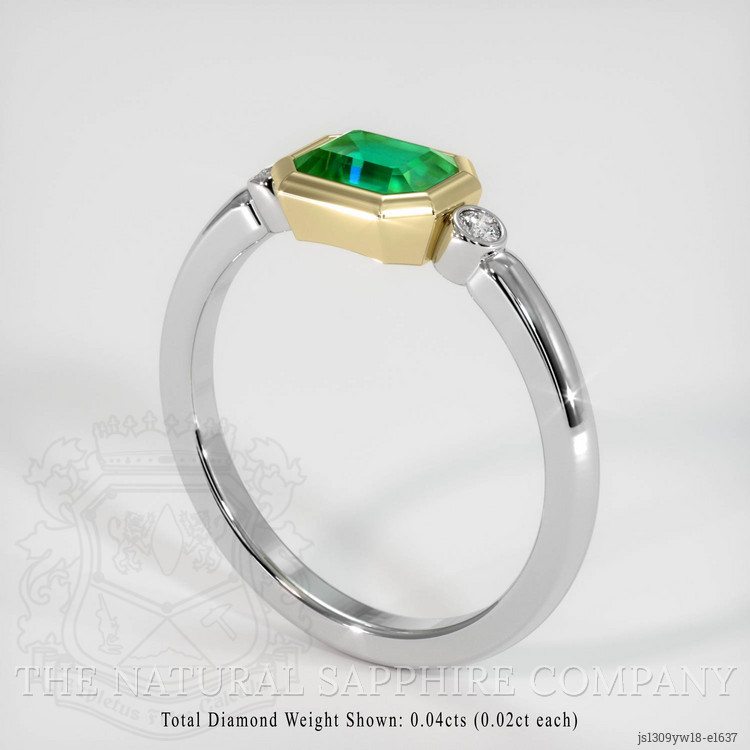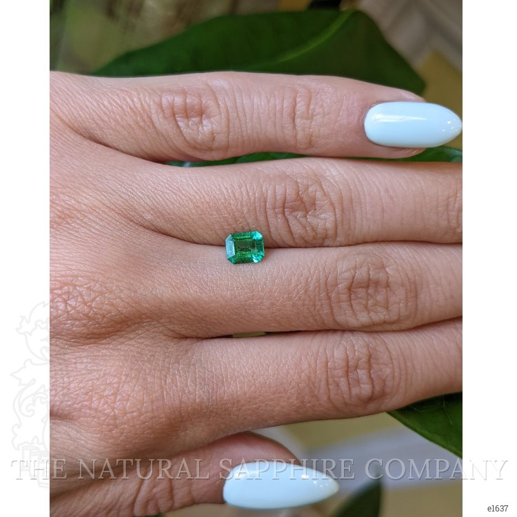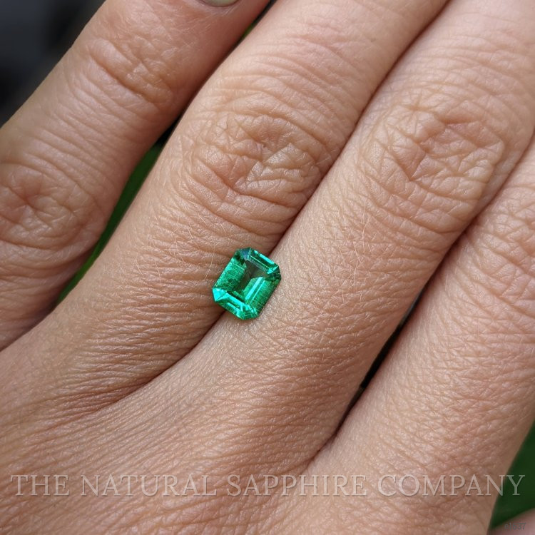 The ring features a beautiful, transparent 0.59 carat emerald shape green emerald with the dimensions of 6.11 x 4.98 x 3.03 mm and a emerald cut. It has a clarity grade of very slightly included (evaluated at eye level), medium color saturation, and an excellent polish. The origin of this emerald is Zambia.