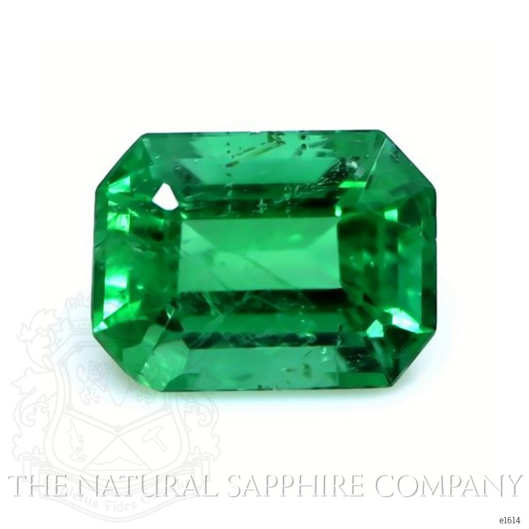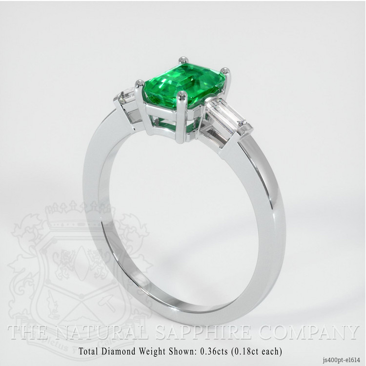 The ring features a beautiful, transparent 1.32 carat emerald shape green emerald with the dimensions of 7.84 x 5.88 x 4.37 mm and a emerald cut. It has a clarity grade of very slightly included (evaluated at eye level), intense color saturation, and an excellent polish. The origin of this emerald is Zambia.