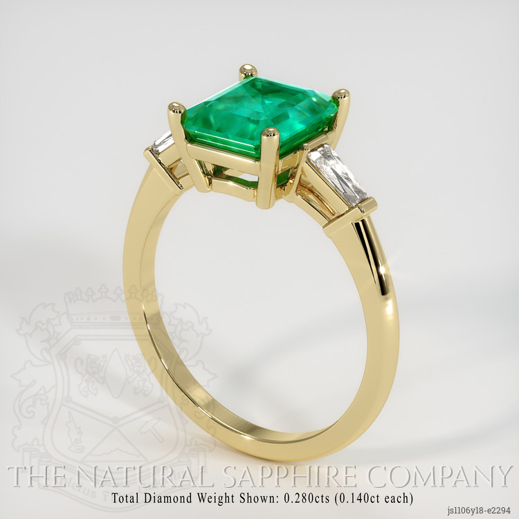 The ring features a beautiful, transparent 1.83 carat emerald shape green emerald with the dimensions of 8.36 x 7.58 x 4.22 mm and a step cut. It has a clarity grade of very slightly included (evaluated at eye level), medium color saturation, and an excellent polish. The origin of this emerald is Colombia.