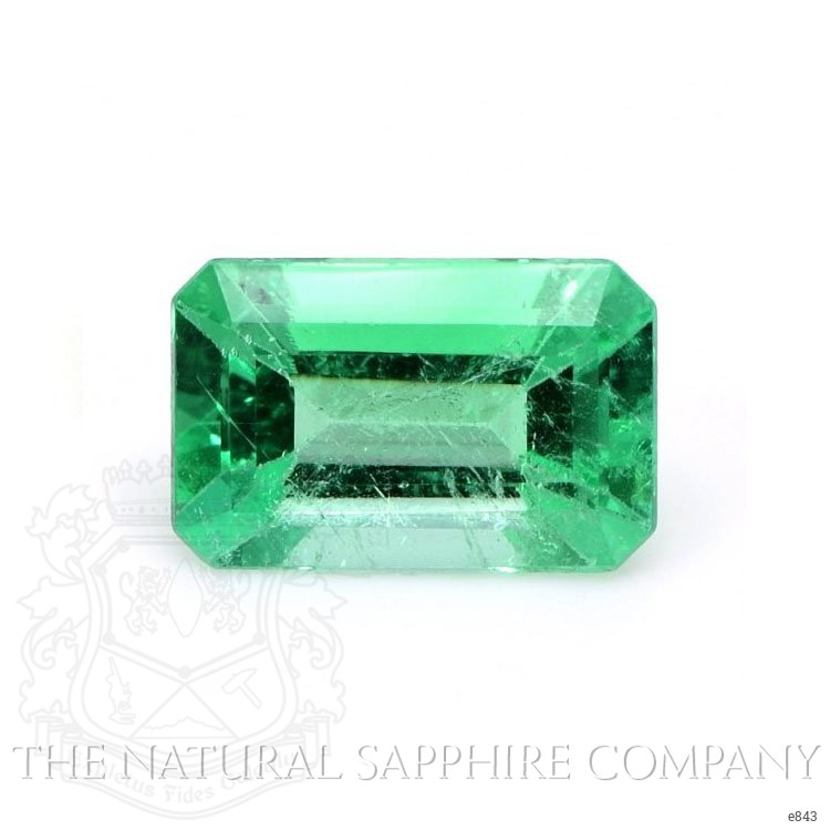 The ring features a beautiful, transparent 2.81 carat emerald shape green emerald with the dimensions of 11.15 x 7.17 x 5.24 mm and a emerald cut. It has a clarity grade of slightly included (evaluated at eye level), medium color saturation, and an excellent polish. The origin of this emerald is Colombia.