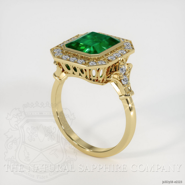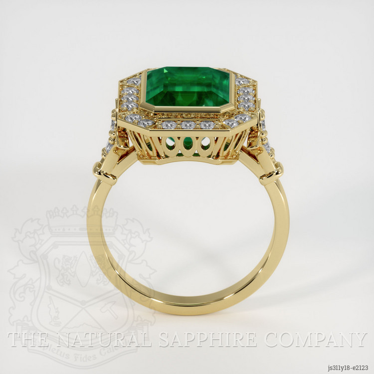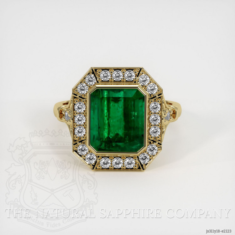 The ring features a beautiful, translucent 3.55 carat emerald shape green emerald with the dimensions of 9.41 x 7.97 x 6.40 mm and a emerald cut. It has a clarity grade of slightly included (evaluated at eye level), vivid color saturation, and an excellent polish. The origin of this emerald is Zambia.