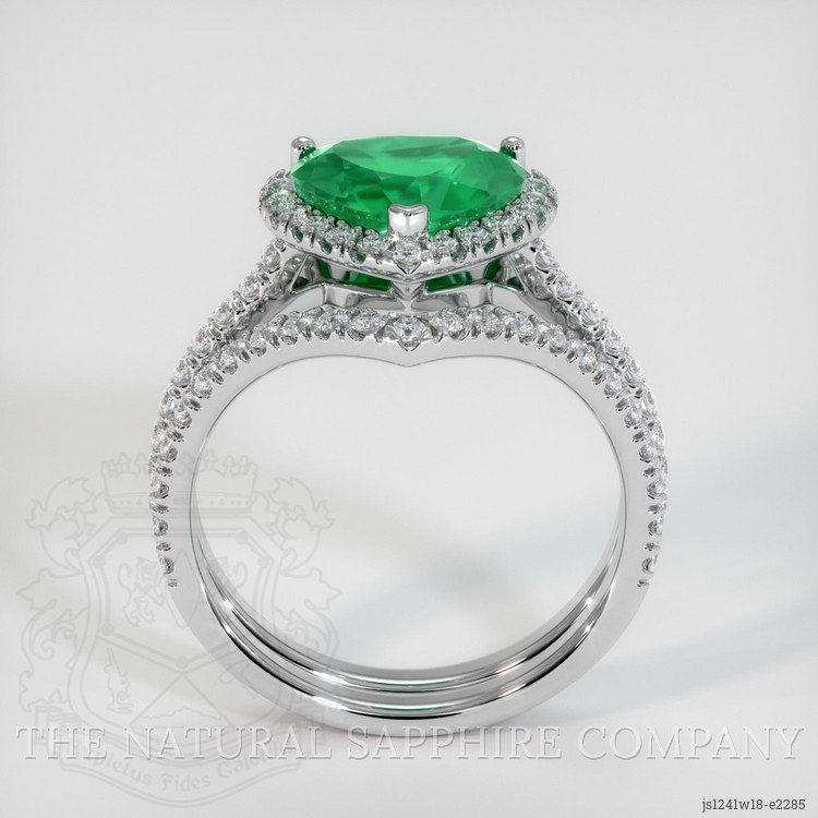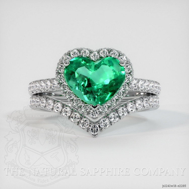 The ring features a beautiful, transparent 1.68 carat heart shape green emerald with the dimensions of 7.15 x 9.08 x 4.96 mm and a step cut. It has a clarity grade of very slightly included (evaluated at eye level), medium color saturation, and an excellent polish. The origin of this emerald is Colombia.