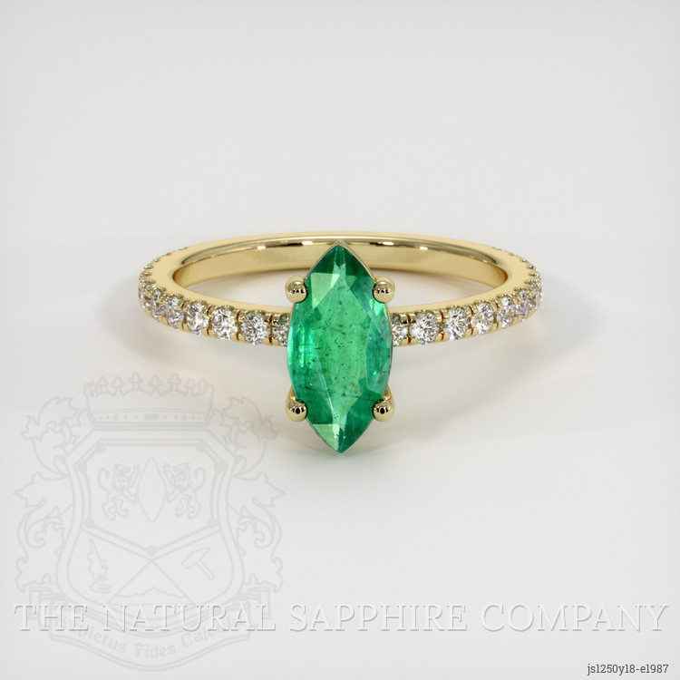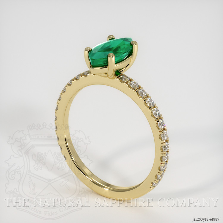 The ring features a beautiful, transparent 0.92 carat marquise shape green emerald with the dimensions of 10.18 x 5.05 x 3.08 mm and a mixed brilliant cut. It has a clarity grade of very slightly included (evaluated at eye level), medium color saturation, and an excellent polish. The origin of this emerald is Zambia.