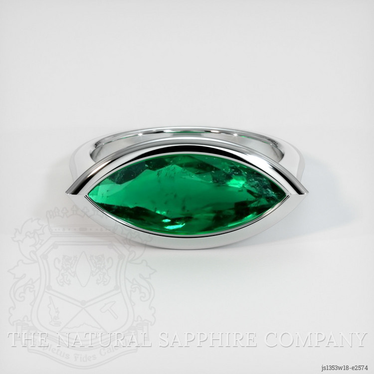 The ring features a beautiful, transparent 2.57 carat marquise shape green emerald with the dimensions of 16.98 x 6.87 x 4.25 mm and a mixed brilliant cut. It has a clarity grade of very slightly included (evaluated at eye level), vivid color saturation, and an excellent polish. The origin of this emerald is Zambia.