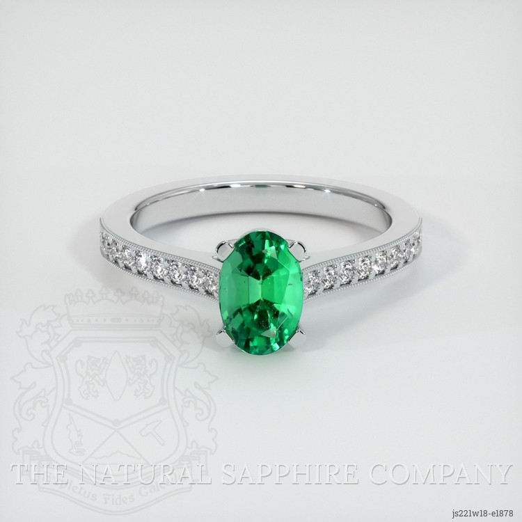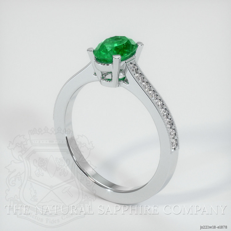 The ring features a beautiful, transparent 0.77 carat oval shape green emerald with the dimensions of 7.06 x 4.79 x 4.12 mm and a mixed brilliant cut. It has a clarity grade of eye clean (evaluated at eye level), intense color saturation, and an excellent polish. The origin of this emerald is Zambia.