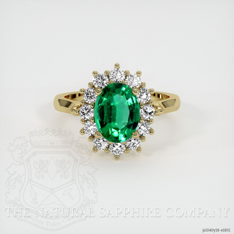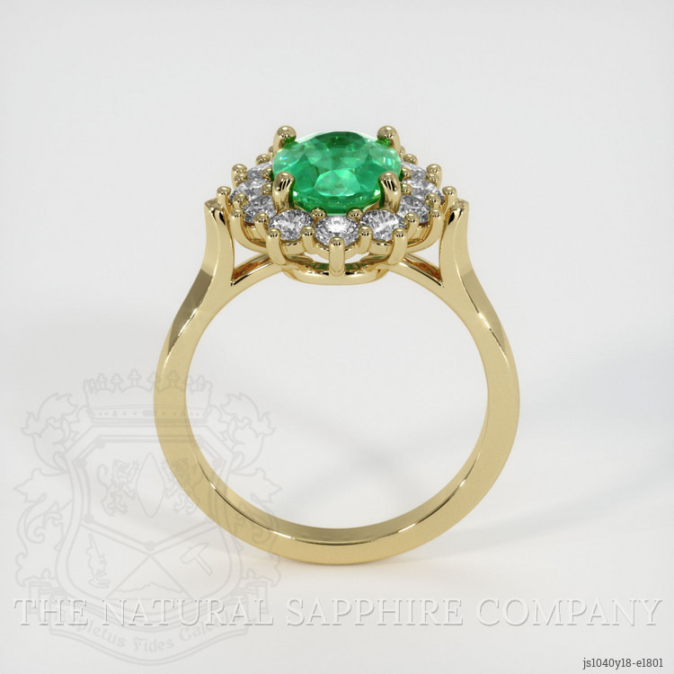 The ring features a beautiful, transparent 1.05 carat oval shape green emerald with the dimensions of 8.10 x 6.19 x 3.66 mm and a mixed brilliant cut. It has a clarity grade of very slightly included (evaluated at eye level), intense color saturation, and an excellent polish. The origin of this emerald is Zambia.