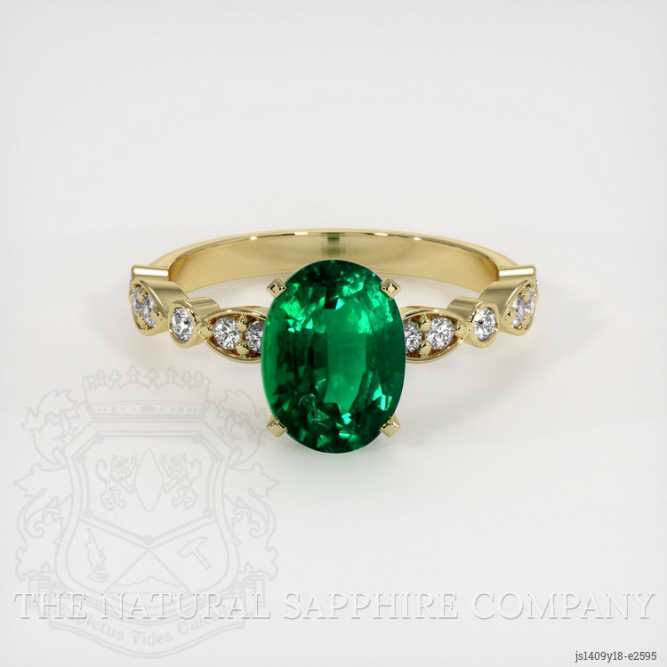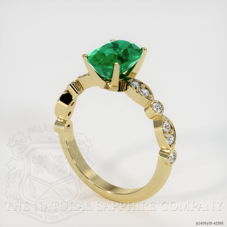 The ring features a beautiful, transparent 1.84 carat oval shape green emerald with the dimensions of 9.16 x 6.97 x 4.87 mm and a mixed brilliant cut. It has a clarity grade of very slightly included (evaluated at eye level), vivid color saturation, and an excellent polish. The origin of this emerald is Zambia.