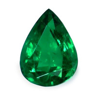 The ring features a beautiful, transparent 1.64 carat pear shape green emerald with the dimensions of 9.29 x 7.01 x 4.93 mm and a mixed brilliant cut. It has a clarity grade of very slightly included (evaluated at eye level), vivid color saturation, and an excellent polish. The origin of this emerald is Zambia.