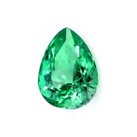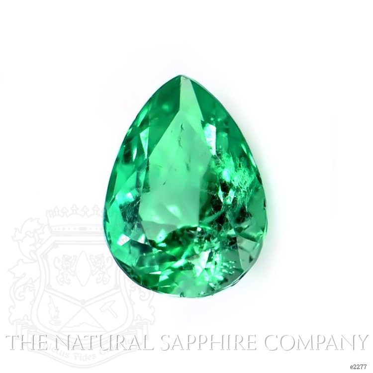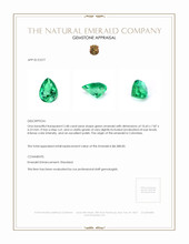 The ring features a beautiful, transparent 2.48 carat pear shape green emerald with the dimensions of 10.65 x 7.87 x 6.23 mm and a step cut. It has a clarity grade of very slightly included (evaluated at eye level), intense color saturation, and an excellent polish. The origin of this emerald is Colombia.