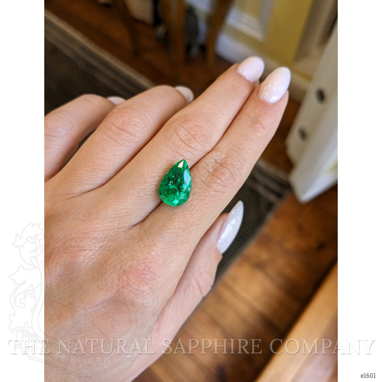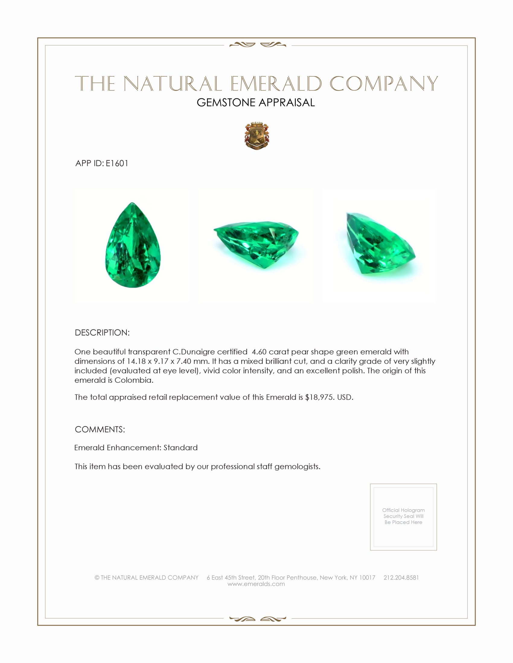 The ring features a beautiful, transparent C.Dunaigre certified 4.60 carat pear shape green emerald with the dimensions of 14.18 x 9.17 x 7.40 mm and a mixed brilliant cut. It has a clarity grade of very slightly included (evaluated at eye level), vivid color saturation, and an excellent polish. The origin of this emerald is Colombia.