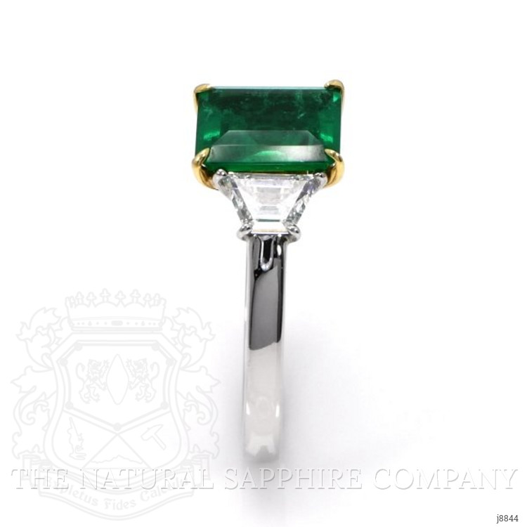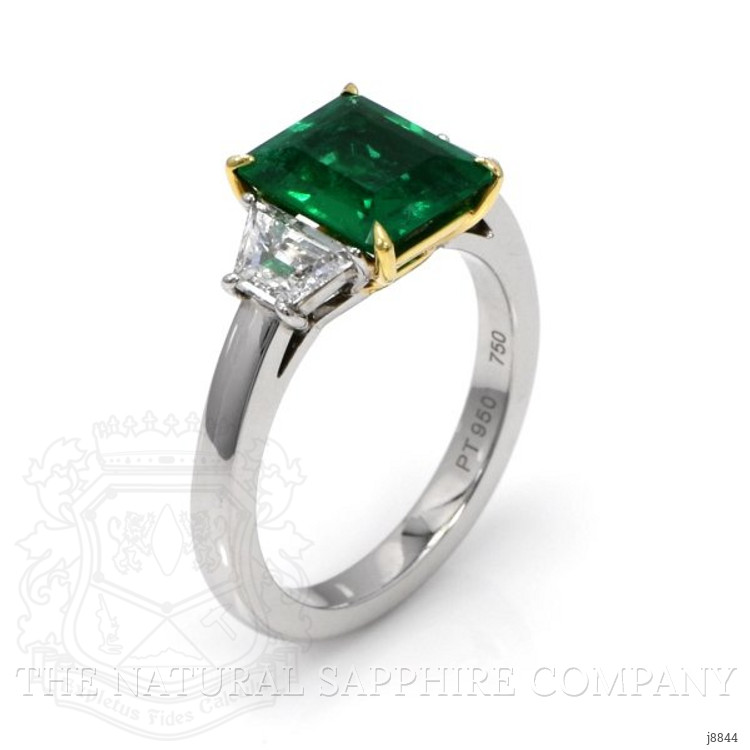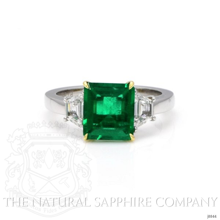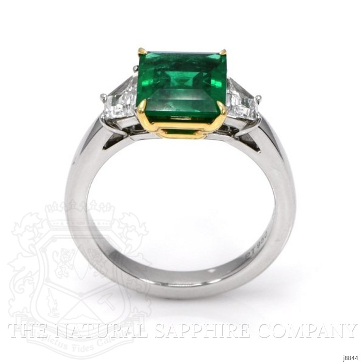 A beautiful transparent 1.85 carat emerald cut emerald with the following dimensions: 8.67 x 7.72 x 3.93 mm. The emerald has an emerald cut, very slightly included clarity grade (graded at eye level), vivid color intensity, and excellent polish. The origin of this emerald is Colombia. The ring also features 2 white trapezoid step cut diamond gemstones of 5.00 x 4.50 x 2.75 mm weighing 0.60 carats. The diamond gemstones have a clarity grade of very slightly included - vs1.