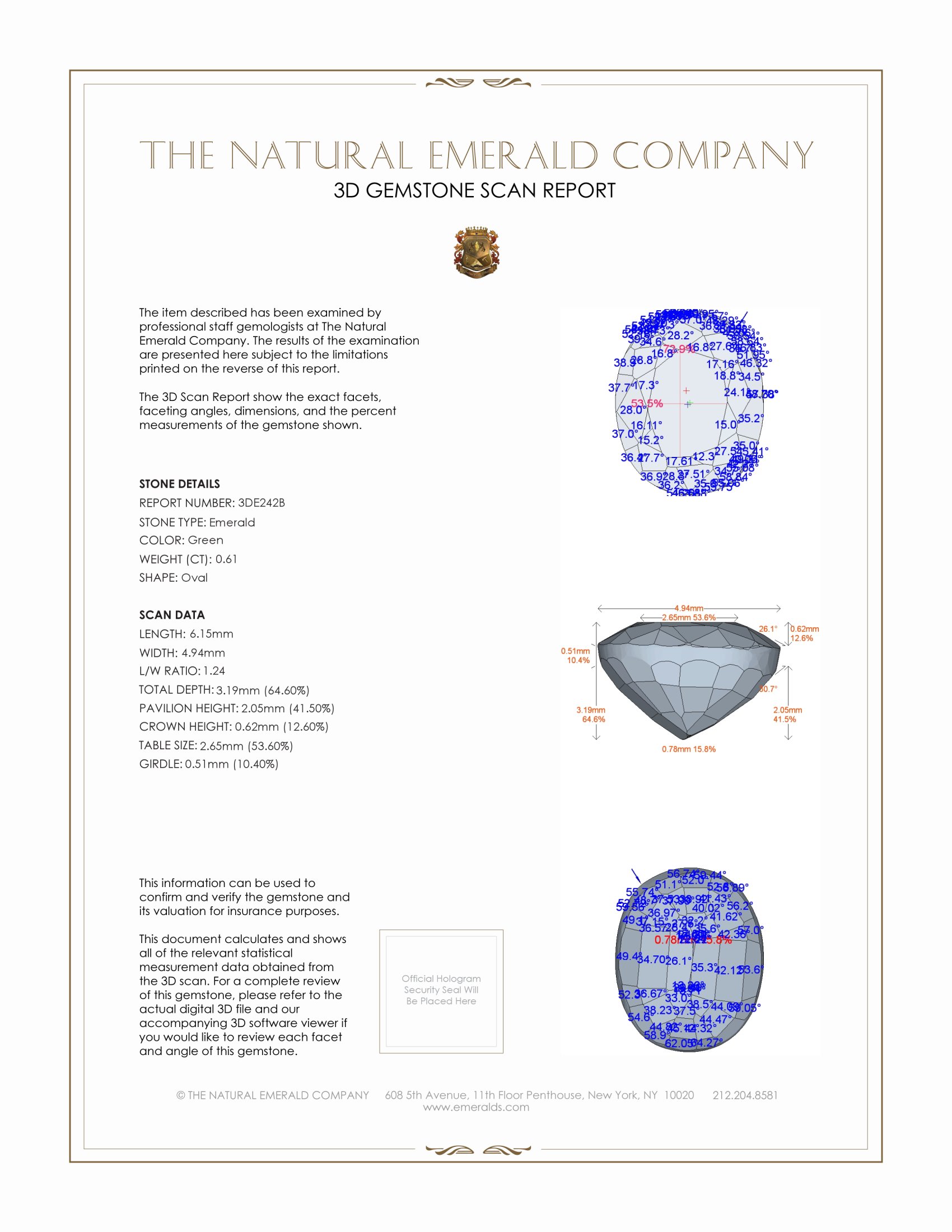 In the world of gemstones, where color dances with light to weave tales as ancient as time, the emerald stands as a testament to Earth’s most splendid artistry. Nestled within the heart of Zambia, our verdant gem emerges, a breathtaking 0.61 carat oval shape, artfully sculpted with mixed brilliant cut. It evokes the lush forests and untamed meadows of its origin. The emerald’s dimensions of 6.15 by 4.94 by 3.19 mm whisper of its graceful form, while the medium color intensity offers a depth that conjures dreamy vistas of rolling hills kissed by the glow of spring.