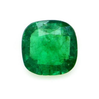 One beautiful transparent 0.68 carat cushion shape green emerald with dimensions of 6.08 x 6.01 x 2.81 mm. It has a mixed brilliant cut, and a clarity grade of slightly included (evaluated at eye level), intense color intensity, and an excellent polish. The origin of this emerald is Brazil.