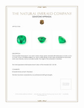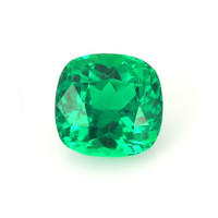 One beautiful transparent 1.43 carat cushion shape green emerald with dimensions of 6.84 x 6.55 x 5.19 mm. It has a modified brilliant cut, and a clarity grade of eye clean (evaluated at eye level), vivid color intensity, and an excellent polish. The origin of this emerald is Colombia.