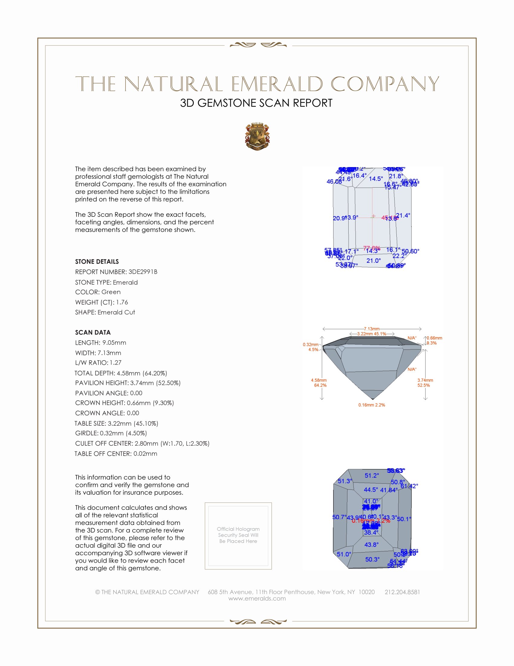 One beautiful transparent 1.76 carat emerald cut shape green emerald with dimensions of 9.05 x 7.13 x 4.58 mm. It has a emerald cut, and a clarity grade of included (evaluated at eye level), light color intensity, and an excellent polish. The origin of this emerald is Brazil.