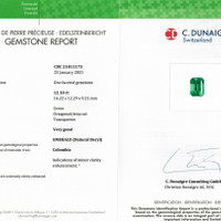 One beautiful transparent C.Dunaigre certified 12.09 carat emerald shape green emerald with dimensions of 16.18 x 12.21 x 9.22 mm. It has a emerald cut, and a clarity grade of very slightly included (evaluated at eye level), light color intensity, and an excellent polish. The origin of this emerald is Colombia.