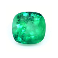 One beautiful transparent 6.46 carat cushion shape green emerald with dimensions of 11.54 x 11.87 x 7.89 mm. It has a mixed brilliant cut, and a clarity grade of slightly included (evaluated at eye level), medium color intensity, and an excellent polish. The origin of this emerald is Colombia.