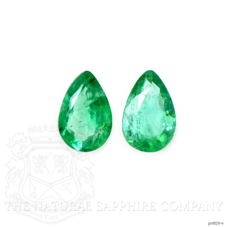 The beautiful, transparent pair of emeralds are 0.40 carats and 0.33 carats respectively. They are pear shape green emeralds, with the dimensions of 6.06 x 4.15 x 2.92 mm and 6.09 x 3.94 x 2.55 mm and are mixed brilliant cut, have a clarity grade of very slightly included (evaluated at eye level), medium color intensity, and an excellent polish. The origin of this pair of emeralds is Zambia.