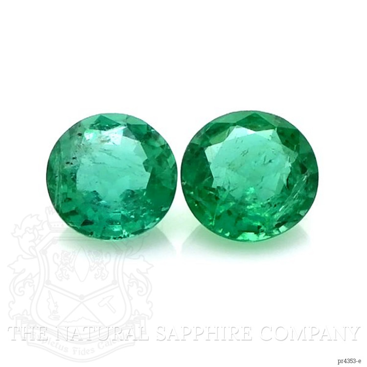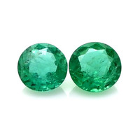 The beautiful, transparent pair of emeralds are 0.53 carats and 0.58 carats respectively. They are round green emeralds, with the dimensions of 5.40 x 5.40 x 3.10 mm and 5.70 x 5.70 x 3.10 mm and are mixed brilliant cut, have a clarity grade of slightly included (graded at eye level), medium color intensity, and an excellent polish. The origin of this pair of emeralds is Zambia.