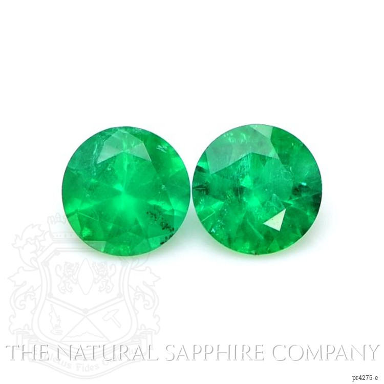 The beautiful, transparent pair of emeralds are 0.59 carats and 0.64 carats respectively. They are round green emeralds, with the dimensions of 5.96 x 5.94 x 3.46 mm and 5.94 x 5.88 x 3.62 mm and are mixed brilliant cut, have a clarity grade of slightly included (graded at eye level), vivid color intensity, and an excellent polish. The origin of this pair of emeralds is Brazil.
